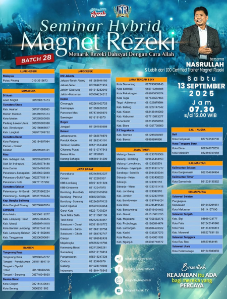 Kajian, seminar, dan pelatihan agar peserta bisa memahami dan mengamalkan prinsip Magnet Rezeki dalam hidup sehari-hari.