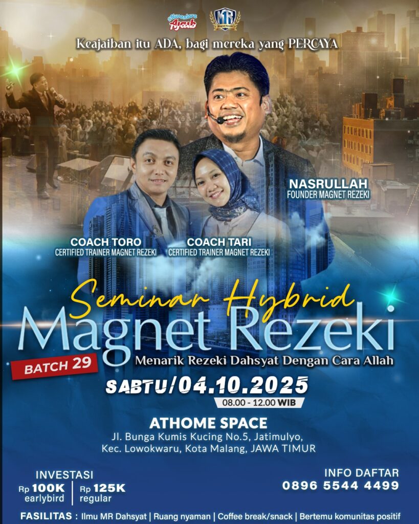 Setiap manusia tentu mendambakan hidup yang berkecukupan, sehat, tenang, dan penuh keberkahan. Namun, sering kali kita lupa bahwa rezeki sejati bukan hanya hasil kerja keras, tetapi juga buah dari ketaatan, syukur, dan cara yang diridhai Allah. Emangnya ada ya seminar yang mengajarkan tentang cara menarik rezeki dahsyat dengan cara Allah? Kalian bisa mengikuti Seminar Hybrid Magnet Rezeki batch 29 di Kota Malang, yang akan disampaikan langsung oleh Certified Trainer yang profesional dan berpengalaman yaitu Coach Tari & Toro.